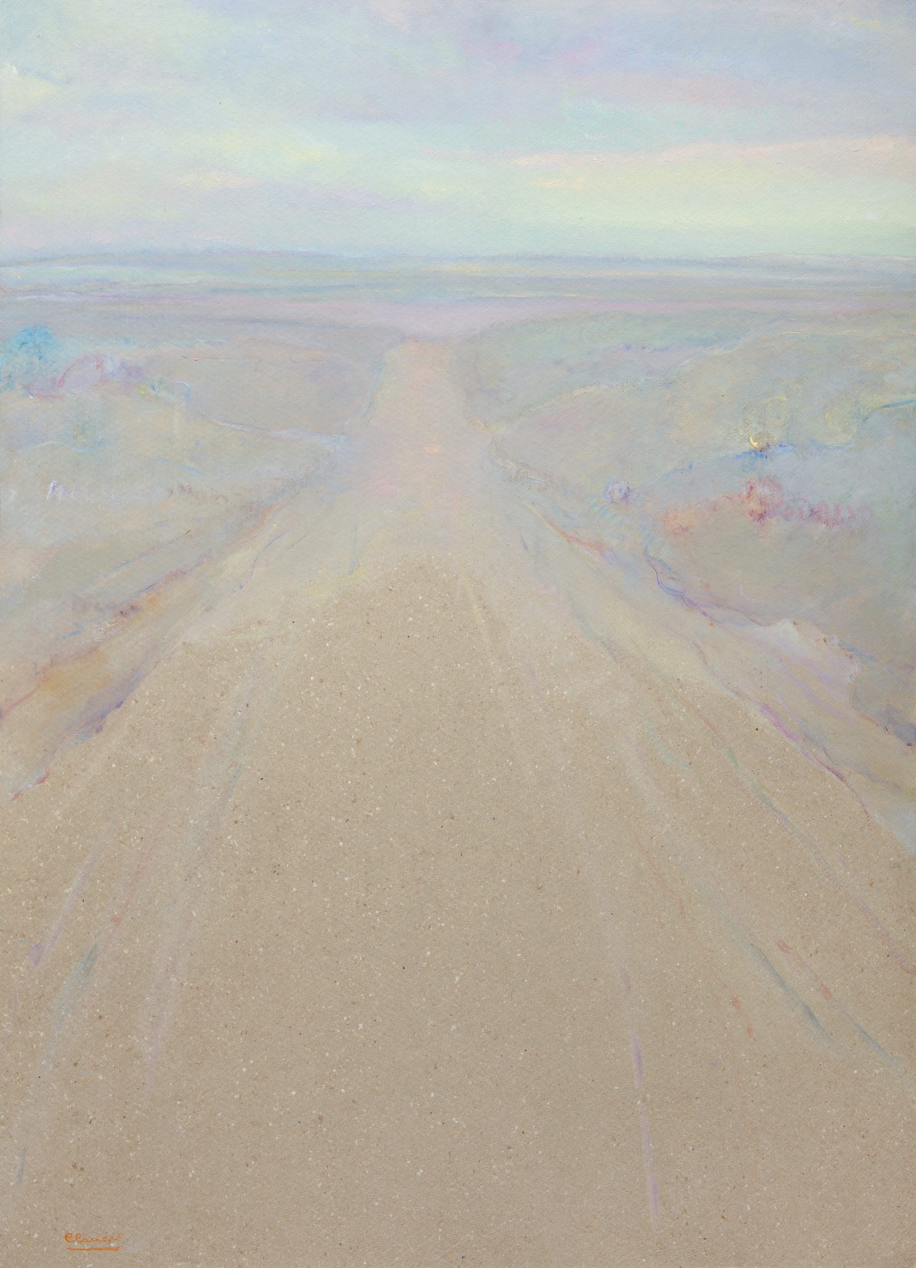 Comentar los paisajes de Claudio es hacerlo teniendo conciencia de su singularidad, esto es, como una manera particular de concebirlos mediante fusión entre visión subjetiva y sentimiento, por lo que sus paisajes antes de ser versiones literales de una realidad, son transfiguraciones sensitivas y poéticas que hacen de ellos un espacio donde la mirada del que los contempla es impelida a sumergirse en un campo de color y luz en el que transita de modo gozoso. El motivo se presenta como una suerte de sinécdoque pictórico, alegóricamente materializado, entre la oscilación de un fragmento iconográficamente expresado de la naturaleza, por ejemplo, una enredadera de lilas, o como visión dilatada de horizontes limitados. Partiendo de esta premisa dual, el paisaje evoluciona de la concreción a un grado sutil de indeterminación que llegará a alcanzar la abstracción de modo semejante a la famosa serie de Ninfeas de Monet, donde la representación de las plantas acuáticas se van desdibujando paulatinamente hasta transformarse en manchas de color y de luz, que antes de definir, evocan paisajes de agua.
